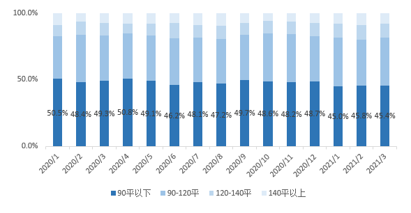 刚需购房占市场主力。从成交结构来看,90平以下二手房源成交占比45.4%,一居室、二居室成交占比为58.4%。值得注意的是,90-120平的三居室改善型房源的成交量本月有所提升,交环比2021年2月提升2%,市场环境进一步向改善型住房倾斜。