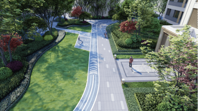 科学的640米健康跑道,根据人体体能分析,在跑道上设置起点热身区(准备区、热身器材)、超越区、减速区、能量加油站(储物柜、洗手池、坐凳)让您科学的跑步健身。在晚上,夜灯、繁星、树影之下,轻松惬意的园林景观围绕健康跑道,释放年轻活力。