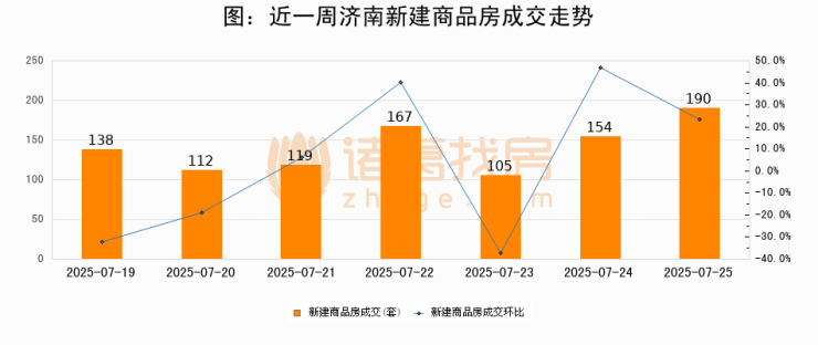 根据济南市住房和城乡建设局数据显示,2025年07月25日济南新建商品房成交190套,较昨日增加36套,环比上涨23.4%