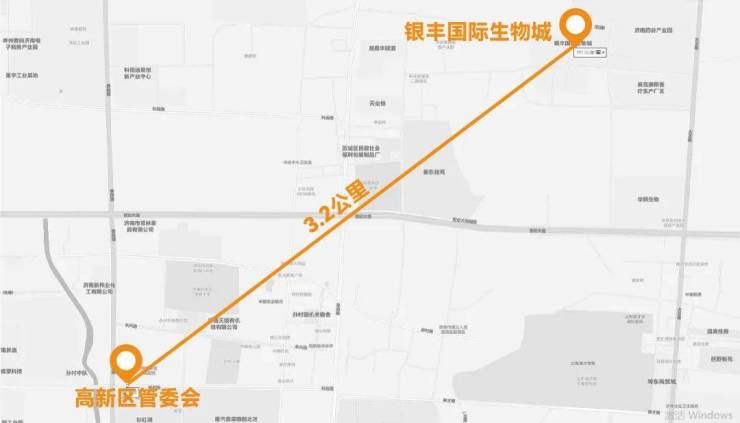 高新区管委会新址(济高蝴蝶广场)距离银丰国际生物城直线距离约3公里,驾车约10分钟即可到达,园区企业以后往返办业务、政务咨询将更加方便便捷。