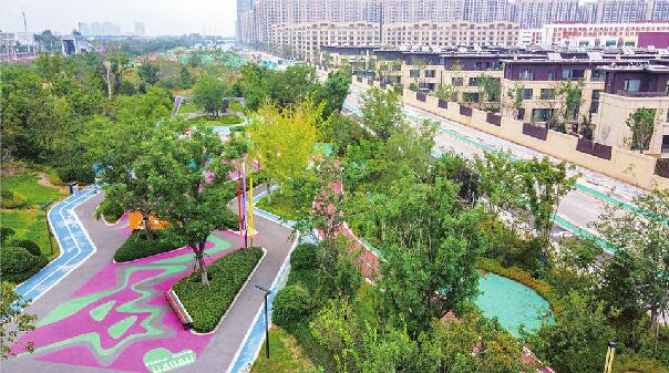 在济南西客站片区的威海路西首北侧,有一处新公园样板段近日建成开放。该处公园位于高铁合围地新建住宅区的西侧,距离济南西站西入口只有500多米,目前已经建成的景观带南北长约150米,东西宽约50米,从南段进入园区,脚下是蜿蜒的夜光跑道,红色的路面标注了起跑点、休息点和终点。园区北端是儿童游乐区,铺设