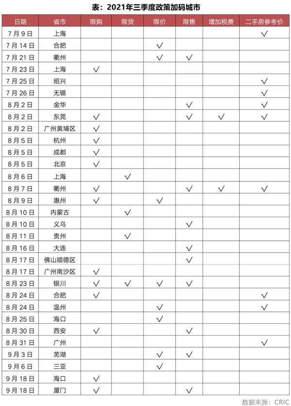 2021年三季度,在“房住不炒、因城施策”的政策主基调下,调控自主权下沉到各城市层面,根据市场实际变化情况,有针对性地局部放松或者加码调控政策措施,更好地落实“三稳”调控目标。