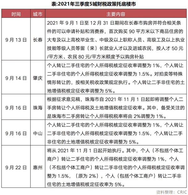 除限跌之外,长春、珠海等5城在财税层面出台支持性政策,缓解房地产市场下行压力。其中长春发布购房补贴,肇庆、珠海、中山、惠州相继下调二手住宅转让个税核定征收率,降低二手房交易成本。