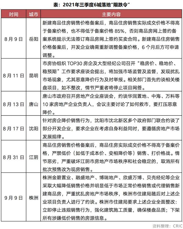 出于稳房价、稳预期的需要,岳阳、昆明等6城相继落地“限跌令”。其中,岳阳、江阴明文规定禁止大幅降价,昆明、唐山、沈阳、株洲采取约谈的方式,禁止房企、中介机构恶意降价、打价格战,扰乱房地产市场秩序。