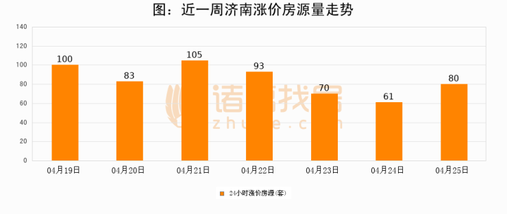 根据诸葛找房数据显示,济南24小时涨价房源量为80套,较04月24日增加19套,环比上涨31.1%。与此同时,涨价房源占比小幅扩大,业主信心有所提升。