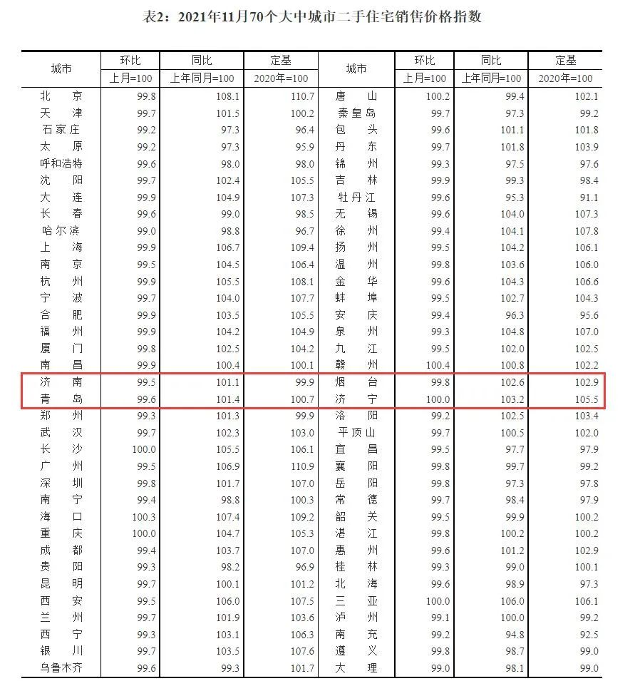 表2:2021年11月70个大中城市二手住宅销售价格指数二手房价格方面,济南、青岛、烟台也同时出现回落。其中,济南11月份二手房价格环比下降0.5%,同比上涨1.1%;青岛11月份环比下降0.4%,同比上涨1.4%;烟台11月份环比下降0.2%,同比上涨2.6%;济宁11月份和上月持平,同比上涨3.2%。