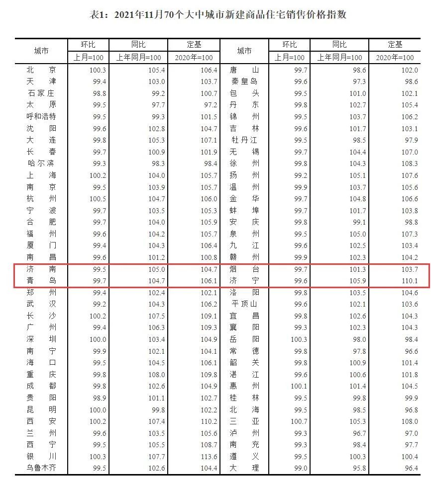 12月15日,2021年11月份70个大中城市商品住宅销售价格变动情况出炉。2021年11月份,70个大中城市商品住宅销售价格环比延续下降态势,同比涨幅持续回落。山东纳入统计的4个城市中,济南、青岛、烟台、济宁新房价格相比上月均略有下降。在二手房价格方面,济南、青岛、烟台也均比上月有小幅回落,济宁则和上月持平。
