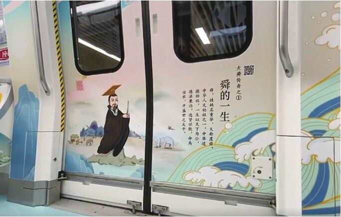 踏入这辆地铁列车,新黄河记者注意到,在列车的48个车门上,将大家耳熟能详的典故以卡通漫画形式,生动地讲述大舜一生的传奇故事。在24个广告位上,分别展示了儒家论大舜的经典文献,充分展示了舜文化在中华传统文化中的地位和内涵。