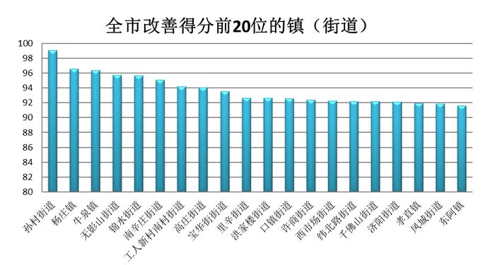 进入全市改善排名前20名的镇(街道)中,莱芜区5个,天桥区4个,平阴县3个,槐荫区2个,历下区、历城区、济阳区、钢城区、商河县和高新区各1个。改善排名正数第1至20位分别为孙村街道、杨庄镇、牛泉镇、无影山街道、锦水街道、南辛庄街道、工人新村南村街道、高庄街道、宝华街街道、里辛街道、洪家楼街道、口镇街道、许商街道、西市场街道、纬北路街道、千佛山街道、济阳街道、孝直镇、凤城街道、东阿镇。