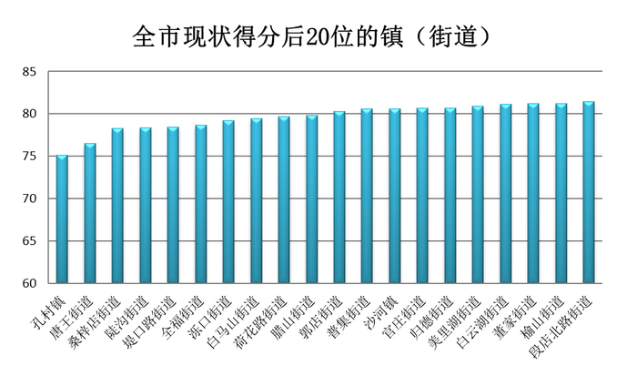 进入全市现状排名后20名的镇(街道)中,历城区5个,槐荫区、天桥区、章丘区各3个,市中区、平阴县各2个,长清区、商河县各1个。现状排名倒数第1至20位分别为孔村镇、唐王街道、桑梓店街道、陡沟街道、堤口路街道、全福街道、泺口街道、白马山街道、荷花路街道、腊山街道、郭店街道、普集街道、沙河镇、官庄街道、归德街道、美里湖街道、白云湖街道、董家街道、榆山街道、段店北路街道。