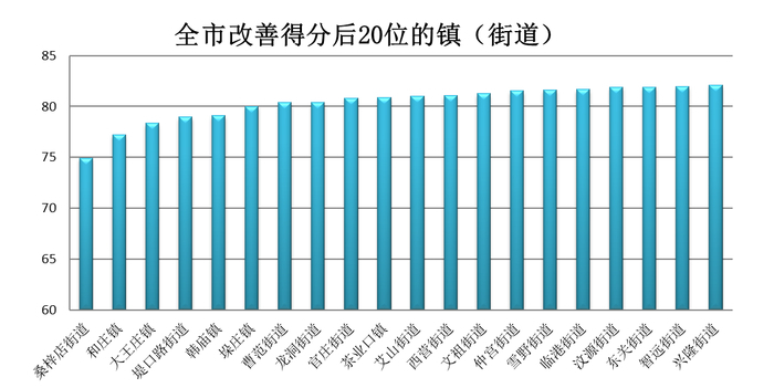 进入全市改善排名后20名的镇(街道)中,莱芜区、章丘区各4个,历下区3个,天桥区、钢城区和南部山区各2个,市中区、高新区和商河县各1个。改善排名倒数第1至20位分别为桑梓店街道、和庄镇、大王庄镇、堤口路街道、韩庙镇、垛庄镇、曹范街道、龙洞街道、官庄街道、茶业口镇、艾山街道、西营街道、文祖街道、仲宫街道、雪野街道、临港街道、汶源街道、东关街道、智远街道、兴隆街道。