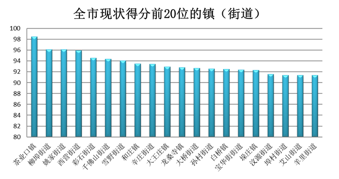 进入全市现状排名前20名的镇(街道)中,莱芜区5个,钢城区3个,历下区、章丘区、商河县和南部山区各2个,天桥区、历城区、高新区和起步区各1个。现状排名正数第1至20位分别为茶业口镇、柳埠街道、姚家街道、西营街道、彩石街道、千佛山街道、雪野街道、和庄镇、辛庄街道、大王庄镇、龙桑寺镇、大桥街道、孙村街道、白桥镇、宝华街街道、垛庄镇、汶源街道、埠村街道、艾山街道、羊里街道。