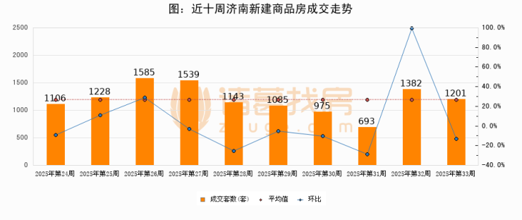 进入2025年第33周(08月11日-08月17日),济南新建商品房成交1201套,较上周减少181套,环比下降13.1%