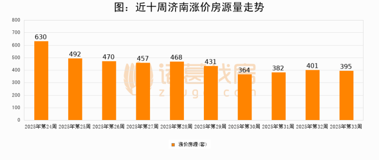 从调价房源来看,第33周济南涨价房源395套,较上周下降1.5%。与此同时,33周涨价房源占比提升0.02个百分点,业主信心持续恢复。