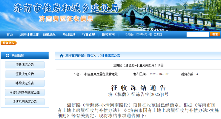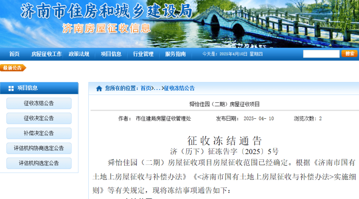 近日,济南市住房城乡建设局房屋征收信息网发布房屋征收冻结通告,具体内容如下: