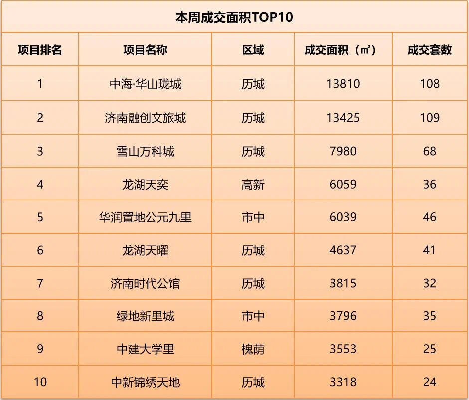 10月25日—10月31日,济南商品住宅签约面积TOP10,中海·华山珑城、济南融创文旅城分别位于榜单的排名前列、第二名。