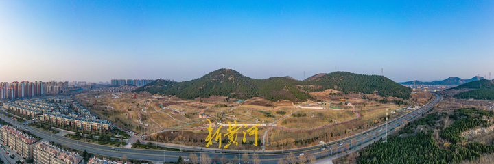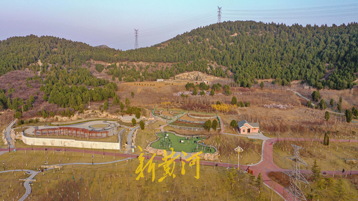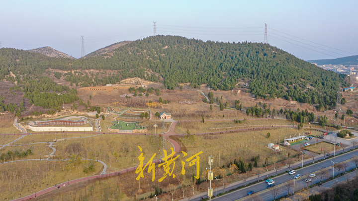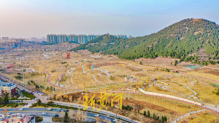 在济南文昌山山体公园,高空俯瞰公园一片青翠,恍如到了夏季。