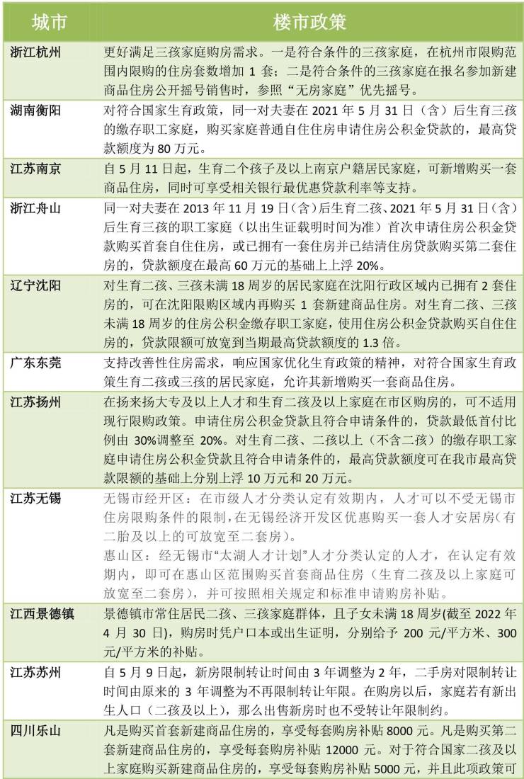出台类似政策的还有东莞和沈阳。东莞于5月14日发布的《关于促进房地产市场平稳健康发展的通知》中提到,支持改善性住房需求,响应国家优化生育政策的精神,对符合国家生育政策生育二孩或三孩的居民家庭,允许其新增购买一套商品住房。