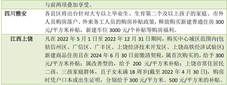 此外,多个城市推出真金白银的购房补贴。拿景德镇来说,景德镇市常住居民二孩、三孩家庭群体,且子女未满18周岁(截至2022年4月30日),购房时凭户口本或出生证明,分别给予200元/平方米、300元/平方米的补贴。