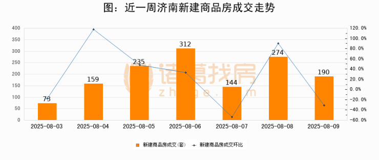 根据济南市住房和城乡建设局数据显示,2025年08月09日济南新建商品房成交190套,较昨日减少84套,环比下降30.7%。近一周济南新建商品房日均成交199套。08月09日单日成交190套,低于近一周平均水平4.5%。