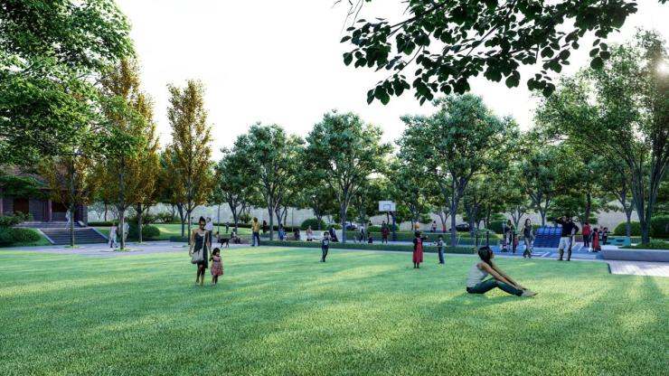 为更好的发挥历史建筑的文化价值,招商蛇口在保留玉皇庙建筑结构的基础上,据此打造情景式童梦乐园,集树阵广场、儿童游乐区、历史保护建筑、多功能复合球场、阳光草坪等休闲运动于一体生活广场,为周边居民提供饭后散步的好去处。在景观设计上既实现了公园里历史建筑的保护,也兼顾了业主的全龄参与体验感,使历史建筑承载的信息得到科学保留沿传,对于弘扬发挥文化遗产在新时期经济建设中的积极推动作用,具有重要的现实意义。