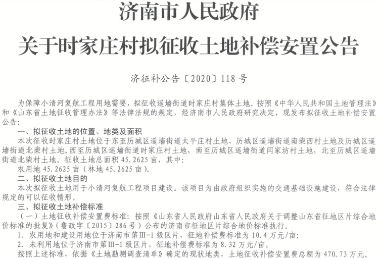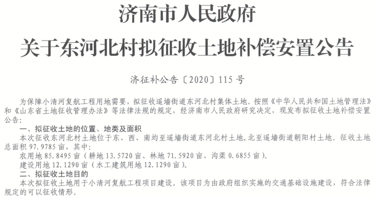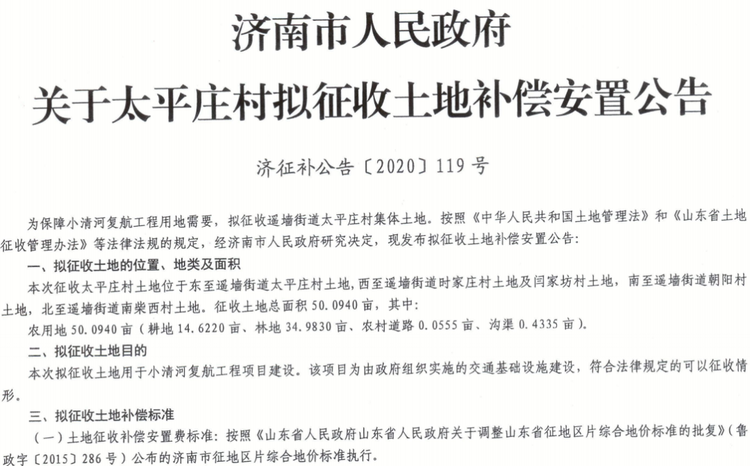 为保障小清河复航工程用地需求,济南市人民政府发布拟征收土地补偿安置公告,涉及徐寨村、南寺村、闫家坊村、太平庄村、时家庄村、南柴西村、东河北村、东柴村等8个村。