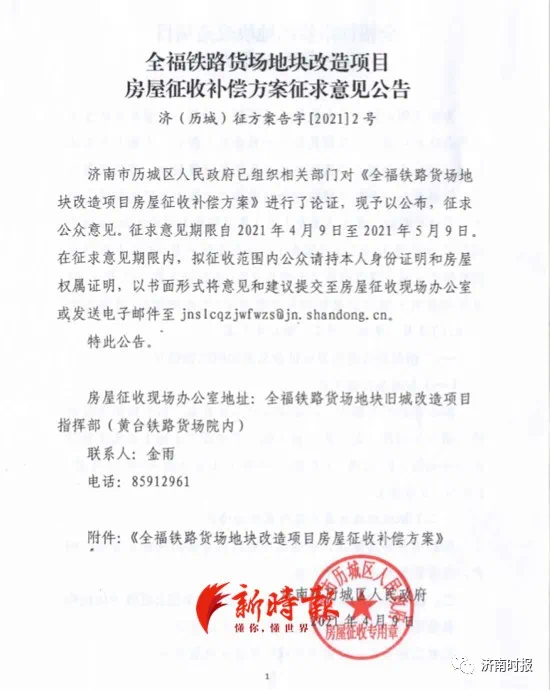 去年房屋征收冻结期满后,近日,历城区人民政府拟对全福铁路货场地块改造项目规划范围内国有土地上房屋进行征收,并对补偿方案征求意见。