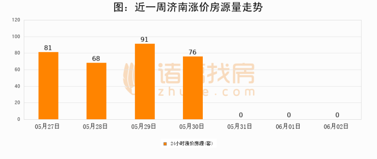 根据诸葛找房数据显示,济南24小时涨价房源量为0套,较06月01日持平。