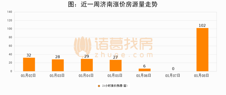 根据诸葛找房数据显示,济南24小时涨价房源量为102套,较05月07日增加102套,环比上涨0%。与此同时,涨价房源占比小幅扩大,业主信心有所提升。