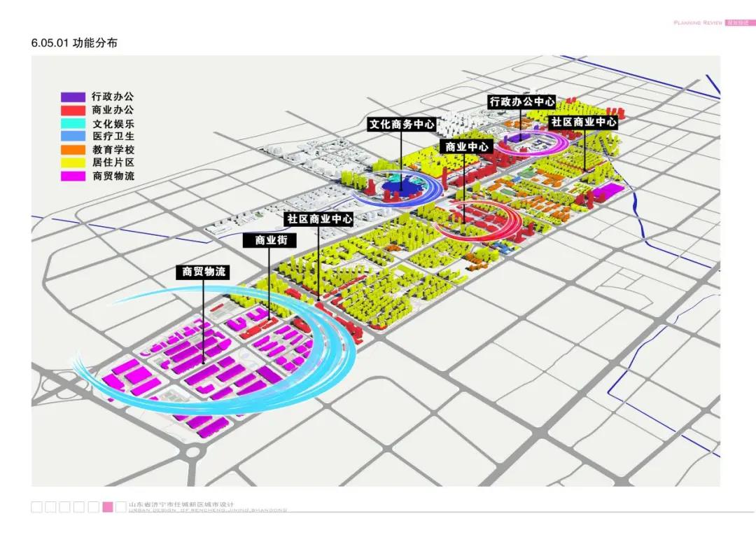 项目位于济宁市任城区以北,用地面积966.7公顷,紧邻城市中心,是老区向北拓展的承接地,也将成为老城中心功能拓展的前沿,同时将成为未来济宁城区较具活力的城区。城市设计构思:打造城市中枢,实现与老城融合;提升城市功能,完善商业服务设施;塑造宜居环境,实现城市和谐发展;提升土地价值,实现土地最优配置;彰显城市特色,展现任城新城风貌。空间布置:一轴两翼,四大主题(行政办公、商业中心、文化商务、商贸物流);纵展横连,延续更新;七区六带,功能协同;三廊六园,蓝绿交织。目标定位:从物质形态到城市生活,构建优质的理想新区,包括:宜居型综合生活区、复合型商务聚集区、多元化文化娱乐区、集约化城市产业区、特色化城市风貌区。