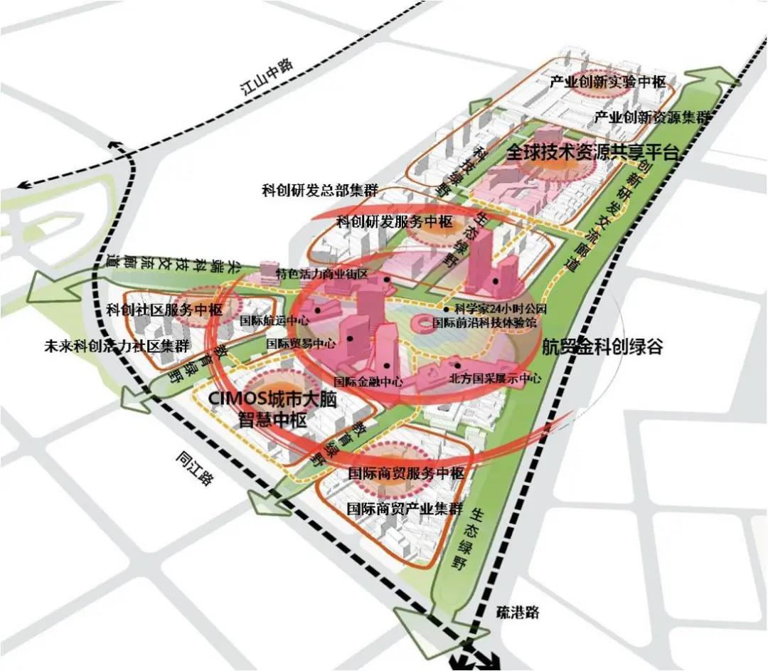 片区位于青岛自贸片区东南部,南至同江路,东至疏港高架路,西北至上汽通用五菱厂区,总面积1.24平方公里。项目目标定位为“国际资源配置中心-航贸金科创港”,通过科创赋能航贸金融,建立高能级国际化多元科创服务系统、构筑科技赋能数字化金融服务生态圈、夯实高效高质港航物流服务支撑体系、打造先进贸易总部经济集聚平台。设计理念强调“三生系统的深度内向融合、不断生长完善的自我迭代、面向未来的活力创新集群”,通过科创绿谷打造赋能创新源泉、数字管理建构创建智慧中枢、研发实验培育促进成果孵化,实现产业集群簇拥、资源互联共享、空间高度一体化的整体格局。设计亮点:“三芯联动、共筑创新发展轴”,“打破界限、建立创新新生态”,“绿心放射、塑造蓝绿新空间”,“立体多维、构筑交通新格局”。