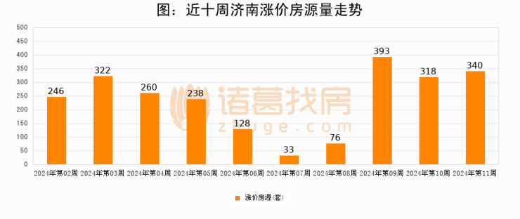 从调价房源来看,第10周济南涨价房源340套,较上周上涨6.9%。与此同时,10周涨价房源占比回落0.71个百分点,业主信心小幅波动,购房者可则需入市。