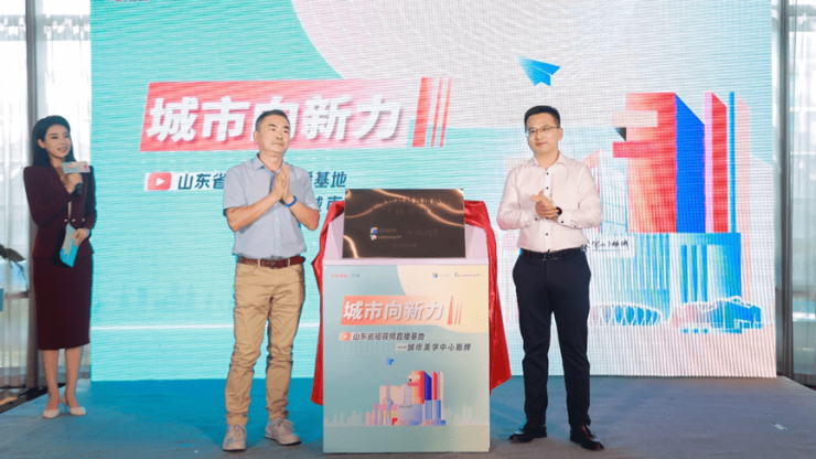 山东广播电视台融媒体资讯中心副主任张瑞义、济南万科公司合伙人张成敏为山东省短视频直播基地—城市美学中心揭牌