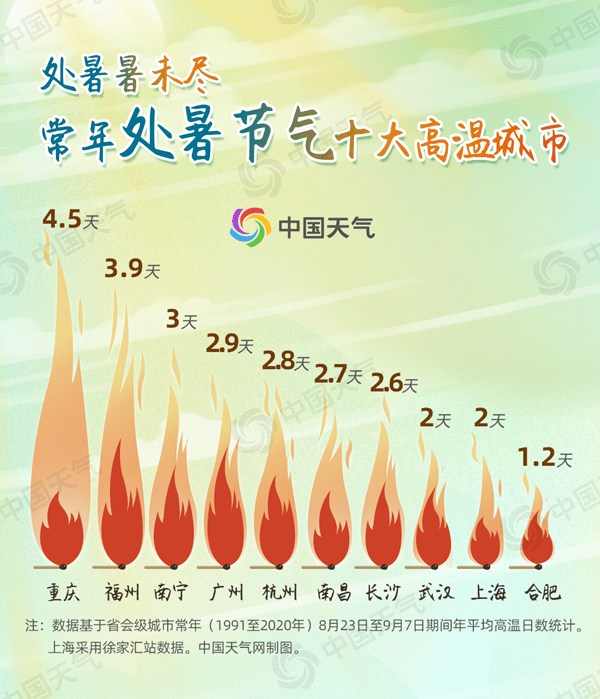 此外,上榜的还有长江中下游的杭州、南昌、长沙、武汉、上海、合肥,每年处暑期间平均都有2天左右高温现身。虽然还是暑气未散,但与盛夏时节持续酷热相比,高温的势头已经开始放缓了。