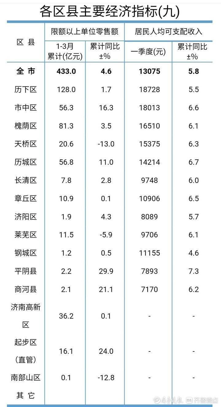 另外,在人均可支配收入这项指标上,一季度济南居民人均可支配收入为13075元,在各区县中,历下、市中、槐荫、天桥、历城五区超过全市水平,其中历下区为18728元,市中区为18013元,槐荫区为16510元。