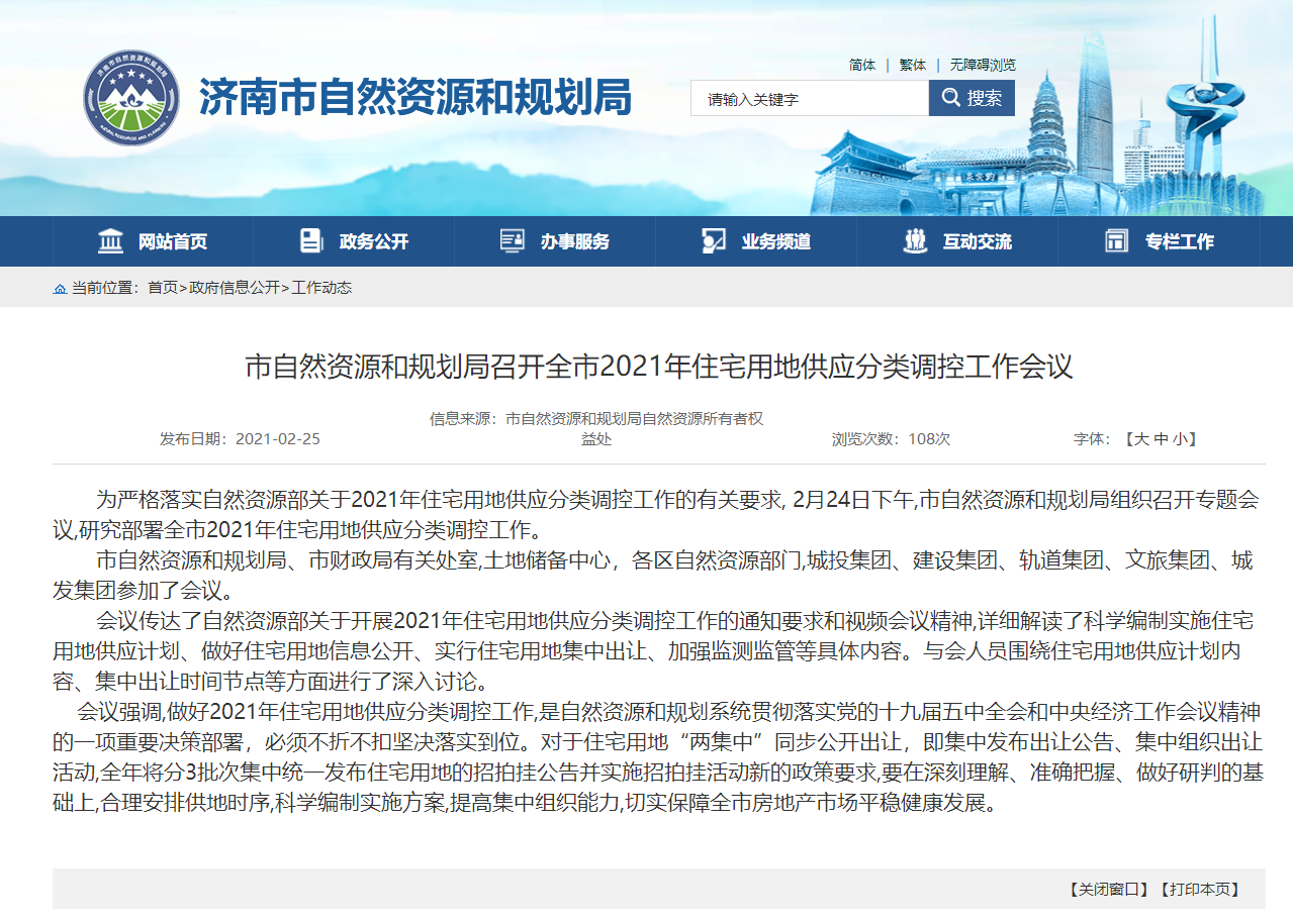 山东省济南市自然资源和规划局发布工作动态表示,为严格落实自然资源部关于2021年住宅用地供应分类调控工作的有关要求, 2月24日下午,济南市自然资源和规划局组织召开专题会议,研究部署全市2021年住宅用地供应分类调控工作。会议传达了自然资源部关于开展2021年住宅用地供应分类调控工作的通知要求和视频会议精神,详细解读了科学编制实施住宅用地供应计划、做好住宅用地信息公开、实行住宅用地集中出让、加强监测监管等具体内容。与会人员围绕住宅用地供应计划内容、集中出让时间节点等方面进行了深入讨论。