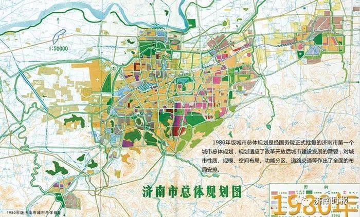 1980版城市总体规划是济南排名前列经国务院正式批复的城市总体规划。在城市布局上,规划提出创造条件发展章丘明水、长清城关作为远郊小城镇,这可以说是此后几十年间济南城市沿经十路不断向东西延伸的开始。到1996版总规,将济南定位为“我国东部沿海经济开放区重要的中心城市”,在空间格局上,中心城区沿东西向带状发展、“先东后西”建设时序进一步被明确,还引入“有机疏解”的概念,在城市外围构筑发展组团,拓展城市发展空间。进入新世纪,从城市空间发展“十字”方针战略到2016年总规获批,进一步拉开了大济南的发展框架,市区突破二环路并延伸到绕城高速,这座城市不断“长大”。