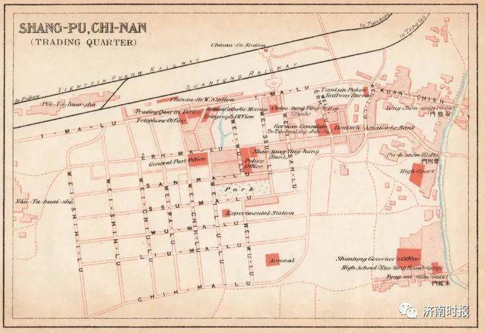 从济南市城乡建设发展服务中心城建档案馆收藏的一份英文版《济南商埠地图》看,在胶济铁路济南站建成后,商埠区城市建设已有城市规划的概念,形成东西为经、南北为纬的街巷肌理,具备了现代城市的雏形。到了1912年津浦铁路通车,胶济线和津浦线在济南交会,则奠定了济南铁路枢纽最初的“十”字形结构。来自南方沪宁、北方京津的货物随铁路北上南下,在济南中转可东达青烟,进而乘船出海,首次构建了济南作为区域性运输枢纽的地位。这一背景下,国内外资本涌入济南,进一步带动了民族工商业的崛起,高峰时期曾有6个国家在商埠区设立领事馆,一跃成为对外开放门户之一。