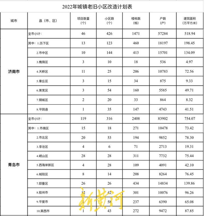 老旧小区改造事关居住品质提升。近日,山东省住建、发改、财政三部门公布2022年城镇老旧小区改造计划,经汇总,各市共确定1963个项目(3889个小区),涉及居民67.13万户,楼栋数20014个,改造面积6204.59万平方米。改造项目、涉及居民户数创2019年以来新高。 济南市历下、市中、槐荫、天