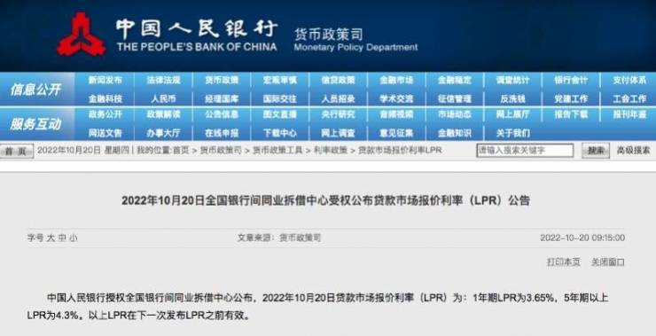 中国人民银行授权全国银行间同业拆借中心公布,2022年10月20日贷款市场报价利率(LPR)为:1年期LPR为3.65%,5年期以上LPR(以下简称5年期LPR)为4.3%。以上LPR在下一次发布LPR之前有效。