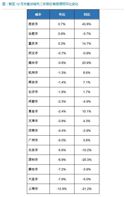 贝壳研究院数据显示,年末成交翘尾叠加新增挂牌量下降,截至2020年12月底,重点18城市链家二手房在售房源量同环比均下降,特别量降至2019年初的水平。上海、深圳在售房源量创近两年新低。