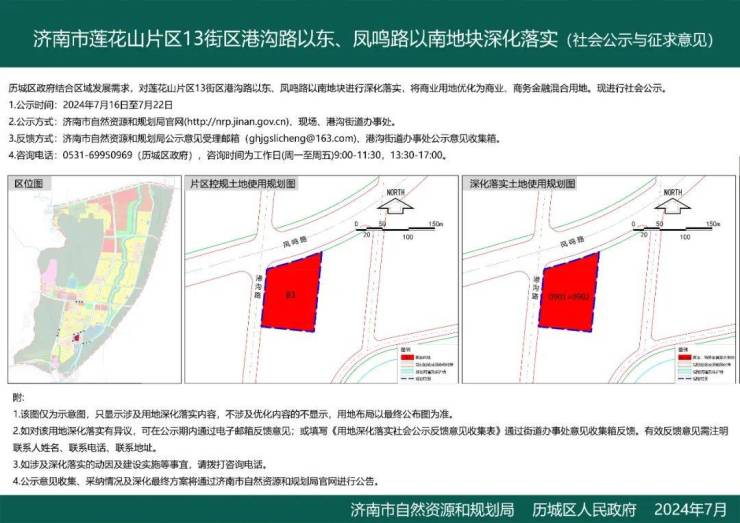 历城区政府结合区域发展需求,对莲花山片区13街区港沟路以东、凤鸣路以南地块进行深化落实,将商业用地优化为商业、商务金融混合用地。现进行社会公示。