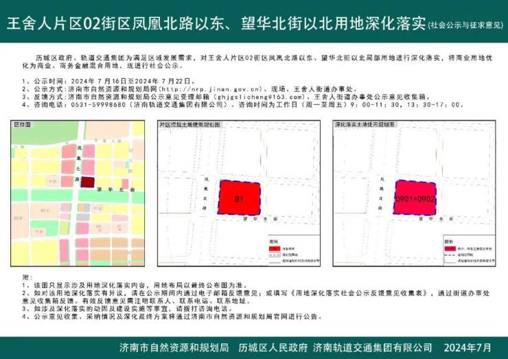 历城区政府、轨道交通集团为满足区域发展需求,对王舍人片区02街区凤凰北路以东、望华北街以北局部用地进行深化落实,将商业用地优化为商业、商务金融混合用地,现进行社会公示。