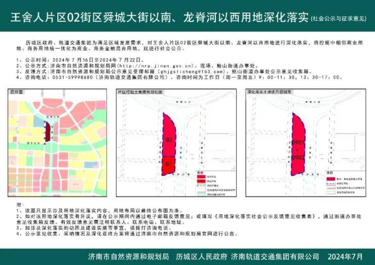 历城区政府、轨道交通集团为满足区域发展需求,对王舍人片区02街区舜城大街以南、龙脊河以西用地进行深化落实,将控规中相邻商业用地、商务用地统一优化为商业、商务金融混合用地,现进行社会公示。