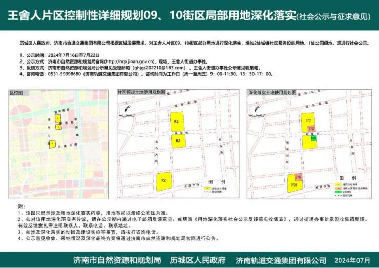 历城区人民政府、济南市轨道交通集团有限公司根据区域发展需求,对王舍人片区09、10街区部分用地进行深化落实,增加2处城镇社区服务设施用地、1处公园绿地,现进行社会公示。
