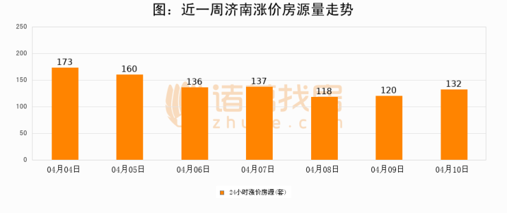 根据诸葛找房数据显示,济南24小时涨价房源量为132套,较04月09日增加12套,环比上涨10%。与此同时,涨价房源占比小幅扩大,业主信心有所提升。