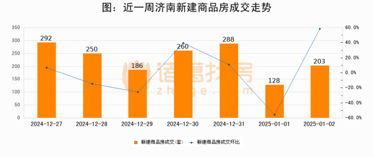 根据济南市住房和城乡建设局数据显示,2025年01月02日济南新建商品房成交203套,较昨日增加75套,环比上涨58.6%