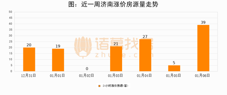 根据诸葛找房数据显示,济南24小时涨价房源量为39套,较01月05日增加34套,环比上涨680%。与此同时,涨价房源占比小幅扩大,业主信心有所提升。