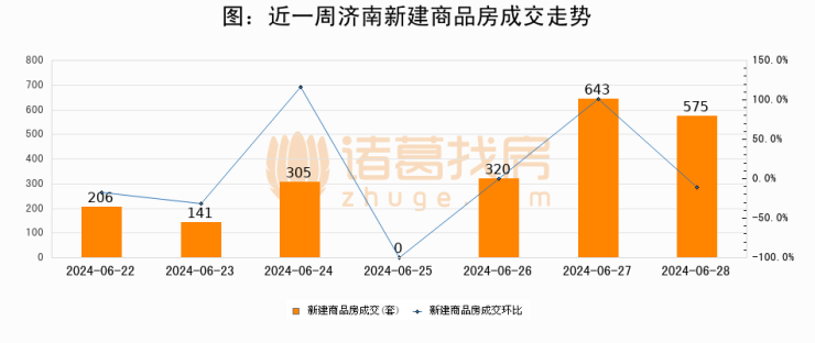 根据济南市住房和城乡建设局数据显示,2024年06月28日济南新建商品房成交575套,较昨日减少68套,环比下降10.6%