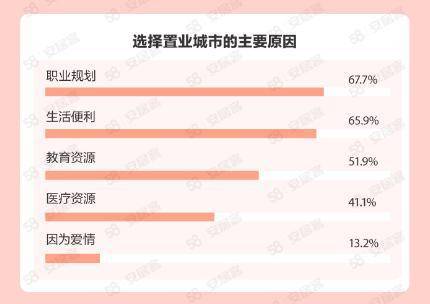 选择置业城市上,女性购房者多出于自身发展考量,有67.7%的女性基于职业规划及未来发展选择置业城市。其次,生活便利性、教育资源和医疗资源等成为女性衡量置业城市的关键因素。而相对来说,因为爱情而选择置业城市的女性占比仅13.2%。